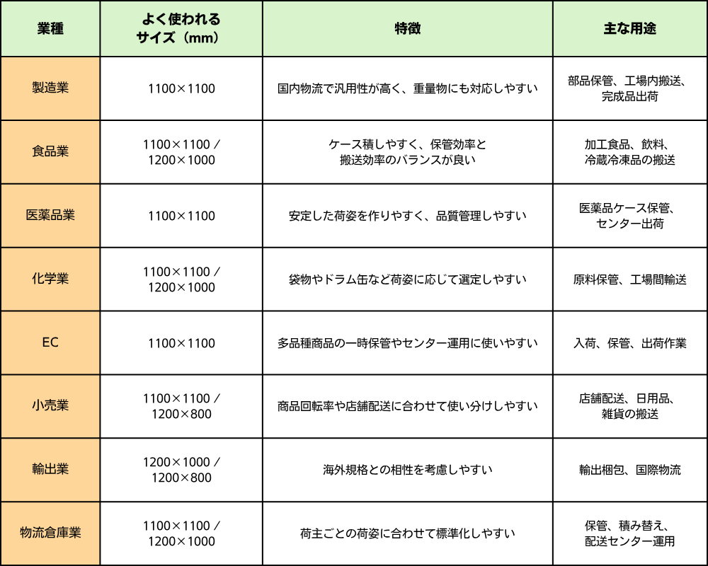 製造業では特に、積載安定性と標準化のしやすさが重視されるため、一覧の中でも汎用性の高い寸法が選ばれやすい傾向があります。