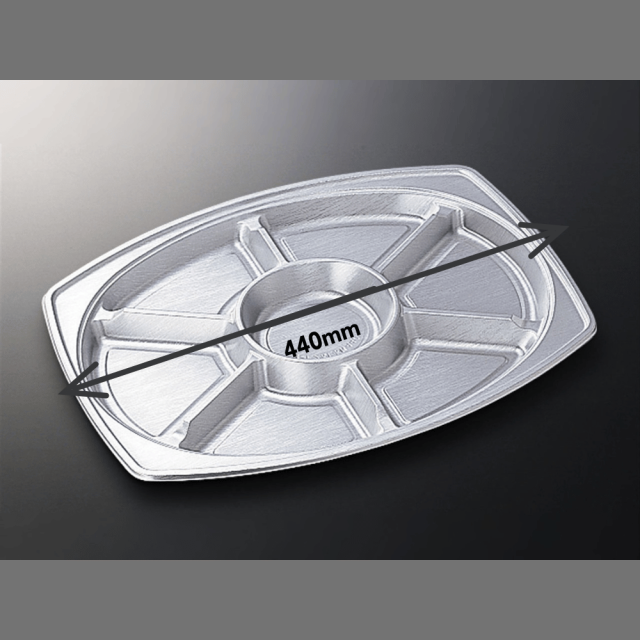 DXオードブルE小判440は、横幅440mmのゆとりある小判型デザインを採用したオードブル向け容器です。丸型とは異なる形状で盛り付けの自由度が高く、料理をバランスよく美しく演出できます。店頭陳列やテイクアウト用途にも適しており、耐熱温度90℃に対応しています。