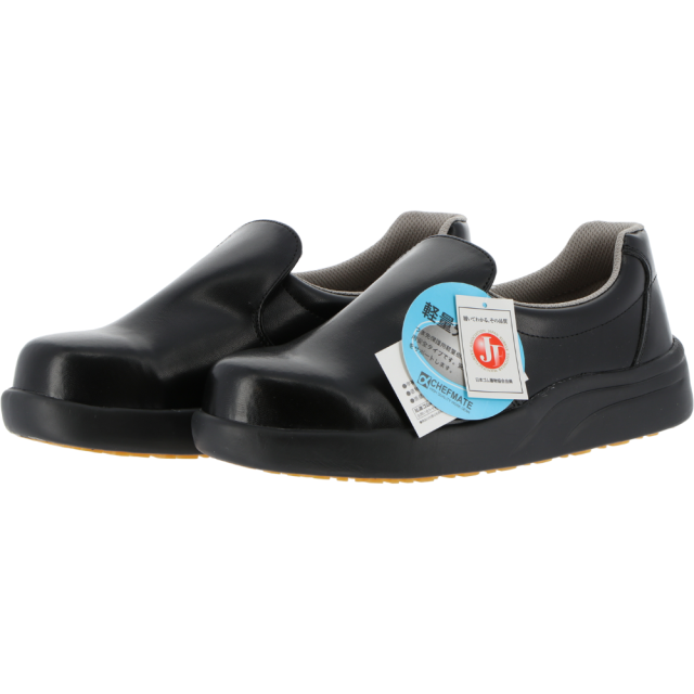 「シェフメイトセーフティー α-300 黒」は、軽作業向けに設計された樹脂先芯入りの安全コックシューズです。つま先部分の先芯が足をしっかり保護しながらも、軽量設計で長時間の作業でも疲れにくい仕様。防滑性能と耐油性能を備えたゴム底により、厨房や食品工場などの滑りやすい現場でも安心して作業ができます。耐久性のある合成皮革アッパーに加え、抗菌加工で衛生面も配慮されています。黒色は汚れが目立ちにくく、さまざまな職場環境に適応します。