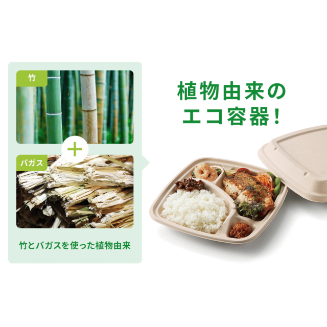 竹とバガスから生まれた、環境に優しく機能性も抜群のテイクアウト容器。浅型設計で料理が映え、電子レンジ対応・耐油耐水性で幅広いメニューに対応可能です。