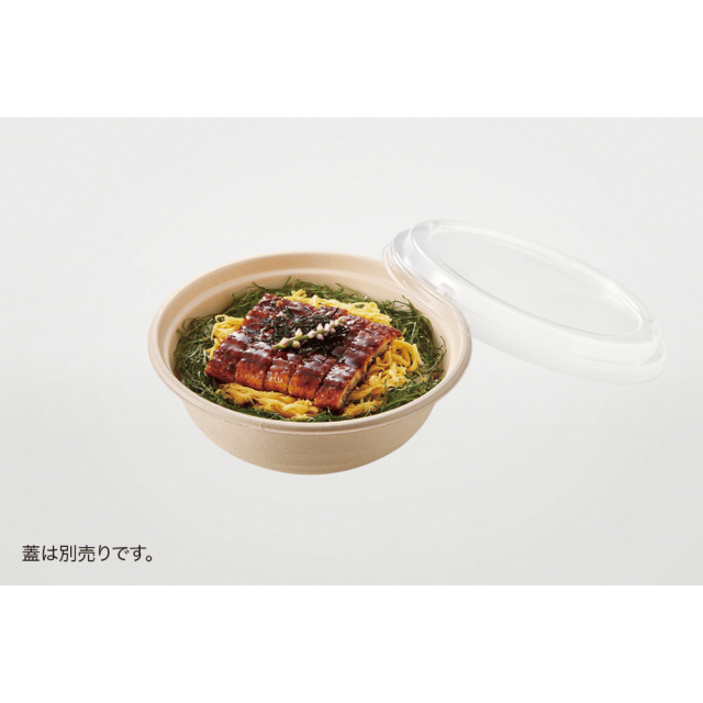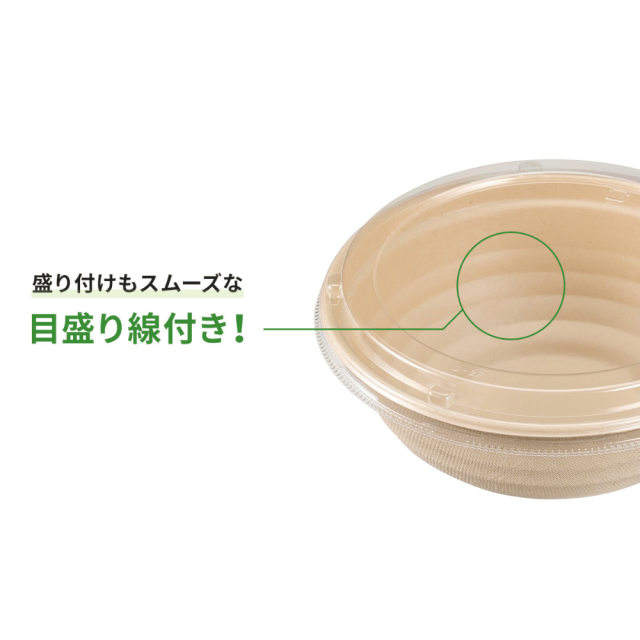 環境にやさしい竹とバガス素材を使用した、電子レンジ対応のどんぶり容器。盛り付けしやすい目盛り線付きで、幅広いメニューに対応するシンプル&高機能なエコ容器です。