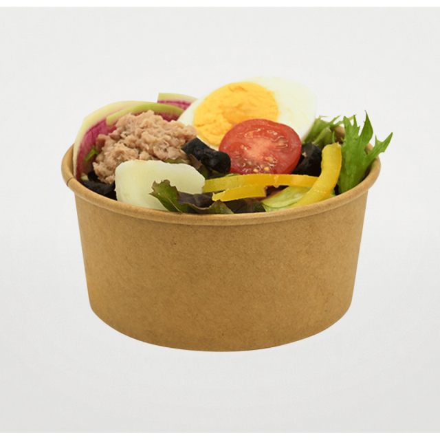 ナチュラルな風合いが魅力のクラフト紙製カップ。PEコーティング付きで耐水・耐油性に優れ、テイクアウトにぴったりな環境配慮型紙容器です。