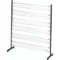 「スリッパ立て SP-42」は、最大12足程度のスリッパをすっきりと収納できる、大容量タイプのスリッパスタンドです。壁面に沿って設置できる設計で、空間の無駄を省きながら、ホテルや旅館の客室、脱履スペースを美しく整えます。フレームにはメラミン焼付塗装を施したスチール、掛け部にはクロームメッキ仕上げを採用し、高級感と清潔感を兼ね備えた外観です。