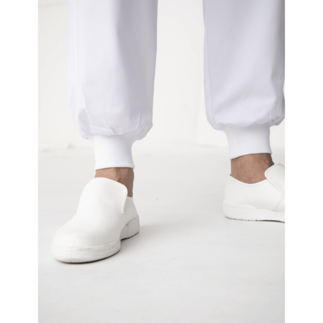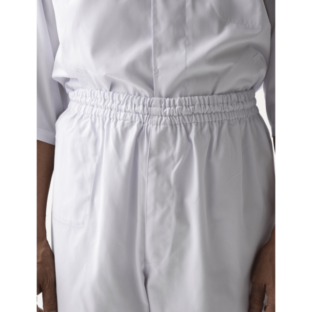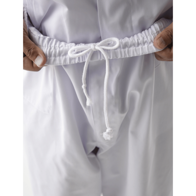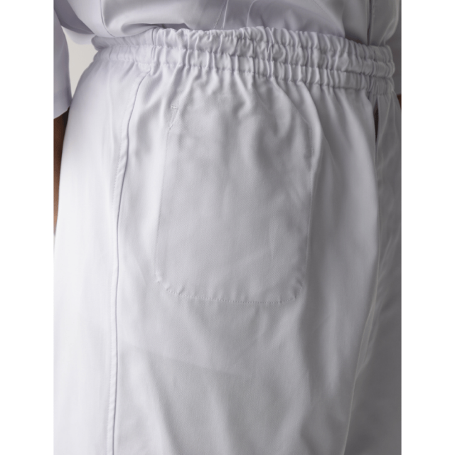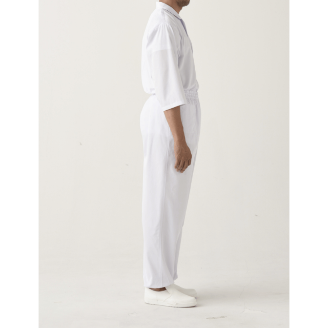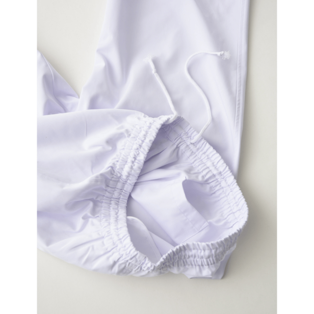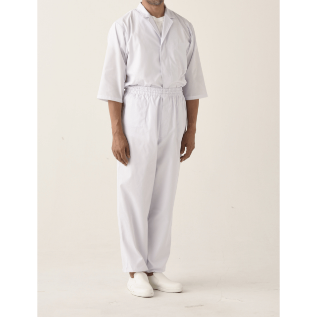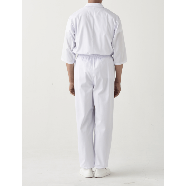 ツイル生地のゴムパンツ。ウエスト内側には紐があります。裾にはリブあり異物混入を防ぎます。右前身頃内側にポケットあり、前中心はファスナー開き仕様。後ろ中心ウエストゴム下の位置内側にカイロ用ポケットがあります。寒い現場には腰から体が温まり働きやすくなります。清潔さと動きやすさを両立した、抗菌加工の男性用ユニフォームパンツ。厨房や食品工場、医療施設など、衛生管理が求められる現場に最適な2着セットです。 仕様: フロントファスナー開き、内ポケット、カイロ用内ポケット、ウエストゴム・紐入