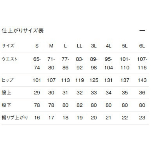 | サイズ | ウエスト(cm) | ヒップ(cm) | 股上(cm) | 股下(cm) | 裾リブ上がり(cm) |