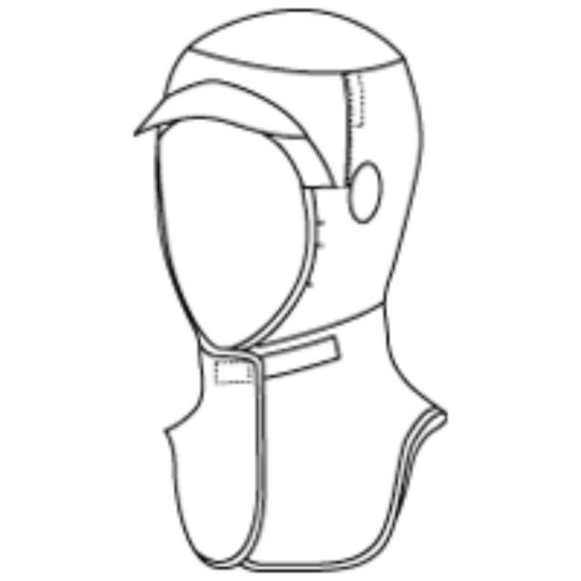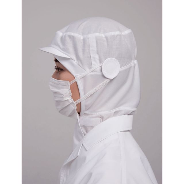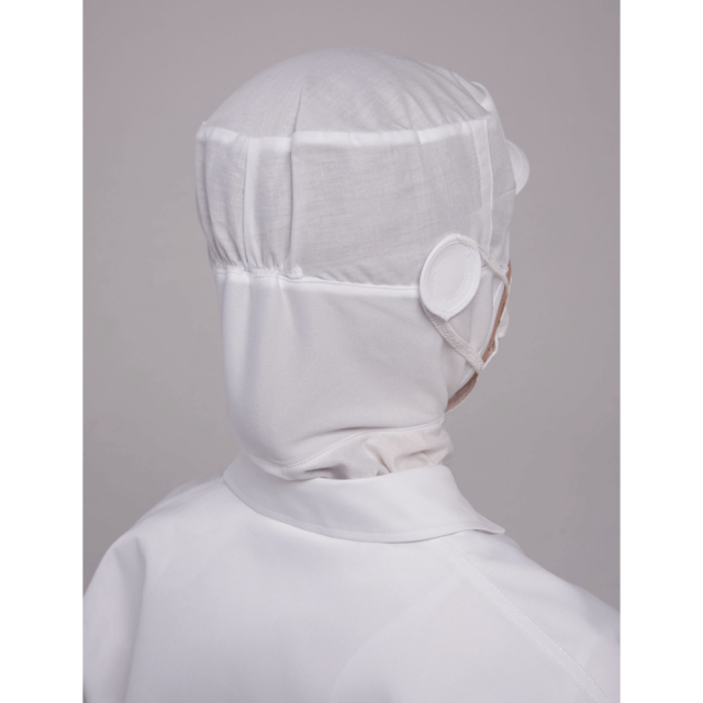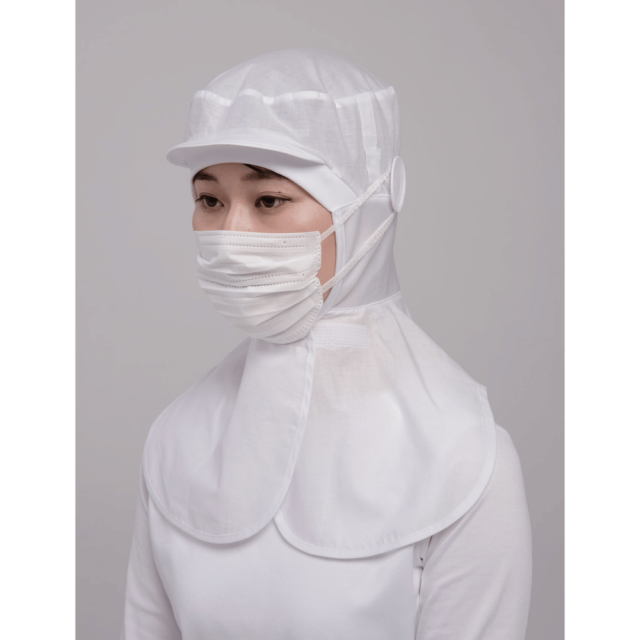 薄手の綿100%ブロードで作られています。肩から見頃にかけてケープがあるので異物混入を防ぐことができ、より安全安心です。額に当たる部分と頬にあたるパイピング、首周りは吸汗性、伸縮性あるジャージー素材で作られています。顎下の前にマジックテープ、頭部後ろにゴム入りギャザー仕様によりしっかりとフィットさせることができます。側頭部にはマスクをかける丸いパーツがあり、眼鏡を通す穴もあります。裏側の縫い目処理はパイピングされ、縫い糸や生地の細かな糸などの異物落下を防ぐ仕様になっています。