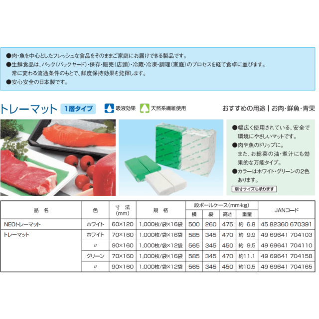「東京メディカル トレーマット」は、70×160mmサイズで食品トレーやパックの底敷きに最適なマットです。食品の鮮度を保持し、見栄えを向上させる効果があり、精肉・鮮魚・惣菜売場などで広く使用されています。ホワイトとグリーンの2色展開で、用途や演出に応じた使い分けが可能。1ケース16000枚入り(1000枚×16袋)の大容量パッケージで、スーパーや食品加工場など業務用に効率的にご利用いただけます。